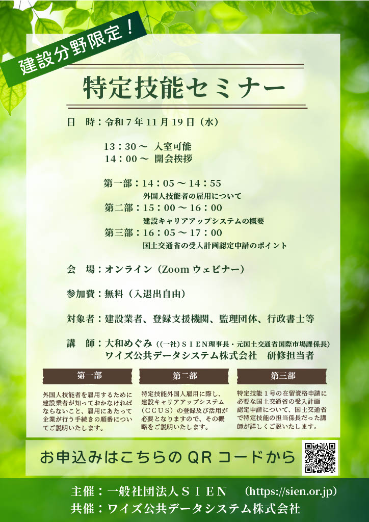 このたび、ワイズ公共データシステム様との共催で、 建設分野の特定技能についての無料セミナーをオンラインで開催す ることとなりました。